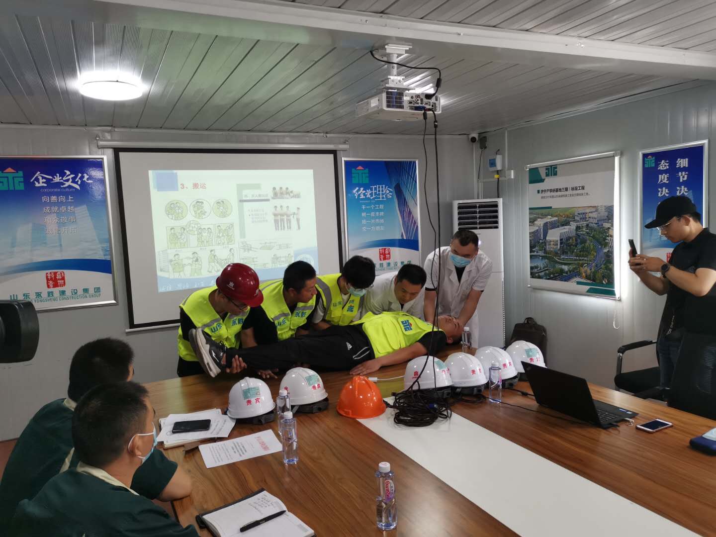 培训会后,现场组织了高温中暑应急演练。中午12时,随着“报告,发现一名员工中暑晕倒”的一声呼叫,演练正式开始。保管员发现人员倒地,初步判断倒地者出现了中暑症状,立即向班组长汇报了现场情况并通知安全员。应急小组立即带上急救药箱、毛巾奔赴现场,迅速判断病情,开始急救:搬移→降温→补水→促醒→送医,每个步骤都有条不紊,演练达到了预期效果,取得了圆满成功,获得了现场人员的一致好评。
