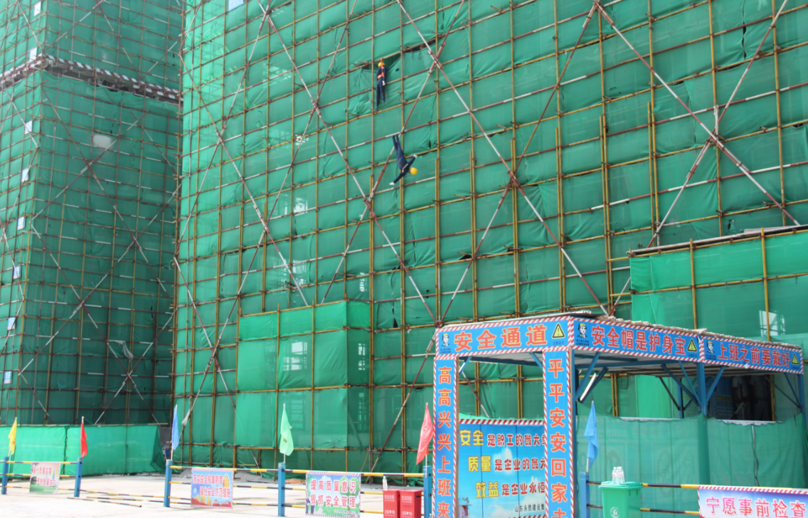 2016年7月8日下午,我公司在泗水县永胜锦城项目部举行了建筑工地安全生产高空坠落应急救援演练现场观摩会,以实战的方式演练脚手架事故的应急救援。